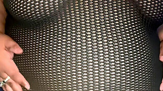 Mrs Mature soles wearing her splendid fishnet dress and toying with her toy.